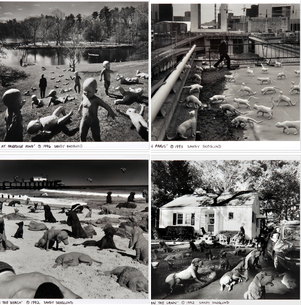 Babies at Paradise Pond (1996) continues her exploration of constructed environments, blending realism with subtle surreal intervention. In Dogs on the Beach (1992), a coastal landscape becomes a rhythmic study of repetition and pattern, while Cats in Paris (1993) introduces a dreamlike urban atmosphere in which animals inhabit and redefine the cityscape. Dogs on the Lawn (1992) similarly transforms a domestic outdoor setting into a carefully orchestrated visual composition that balances familiarity with quiet dislocation.